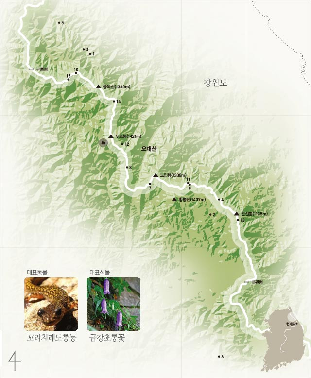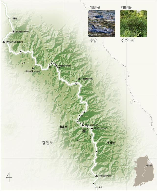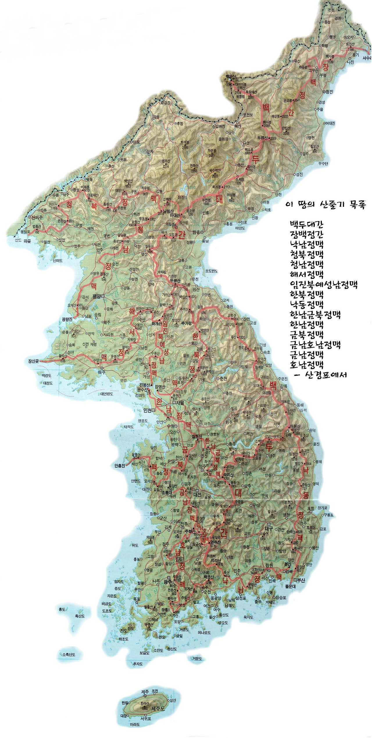백두대간은 백두산에서 지리산까지 이어지는 한반도의 가장 크고 긴 산줄기이다. 우리나라 땅의 근골을 이루는 거대한 산줄기의 옛 이름이다. 조선 영조 때 실학자 신경준이 쓴 산경표 체계에 따라 이름이 붙여졌다. 백두대간은 땅의 지세를 파악하고 지리를 밝히는 데 근본이 된다. 조선 시대에는 행정의 경계를 이루었고 현대에도 각 지방의 자연스런 분계선이 되고 있다. 지형적 연결성과 생물군집의 진화와 퇴보 측면에서 생태학적으로도 중요한 의미를 지닌다.